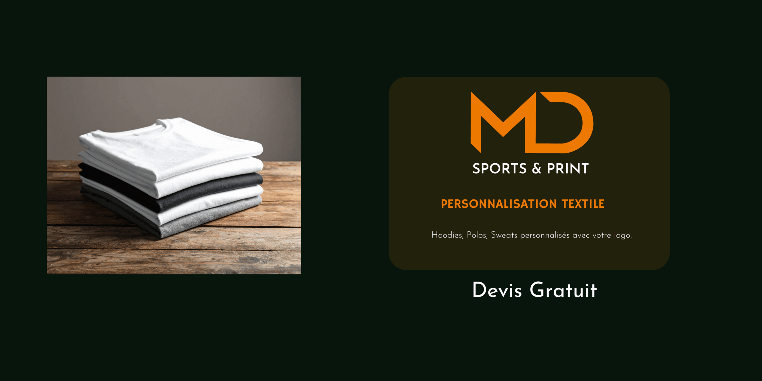 Nos solutions de marquage sont également conçues pour minimiser l’impact écologique. Les encres que nous utilisons pour la sérigraphie et le transfert DTF sont certifiées OEKO-TEX, garantissant qu’elles ne contiennent aucun composant toxique. En choisissant MD Sports pour votre impression textile, vous optez pour une démarche cohérente, alliant qualité professionnelle et respect de la planète. Nous sommes convaincus que performance et responsabilité peuvent aller de pair, et nous mettons tout en œuvre pour vous proposer des alternatives durables sans compromis sur la qualité finale.