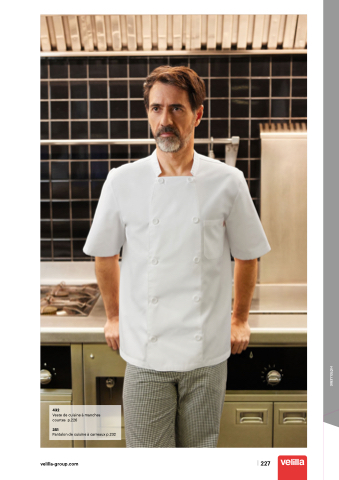 HÔTELLERIE 432 Veste de cuisine à manches courtes p.226 351 Pantalon de cuisine à carreaux p.232 velilla-group.com 227